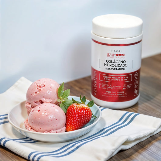 Refréscate con un batido de fresa irresistible, preparado con nuestro colágeno de frutos rojos que le da un extra de sabor y nutrición.