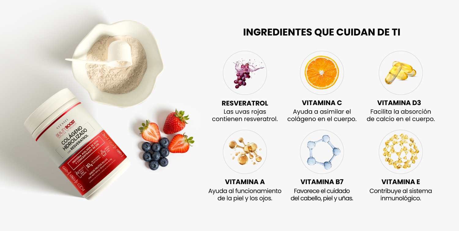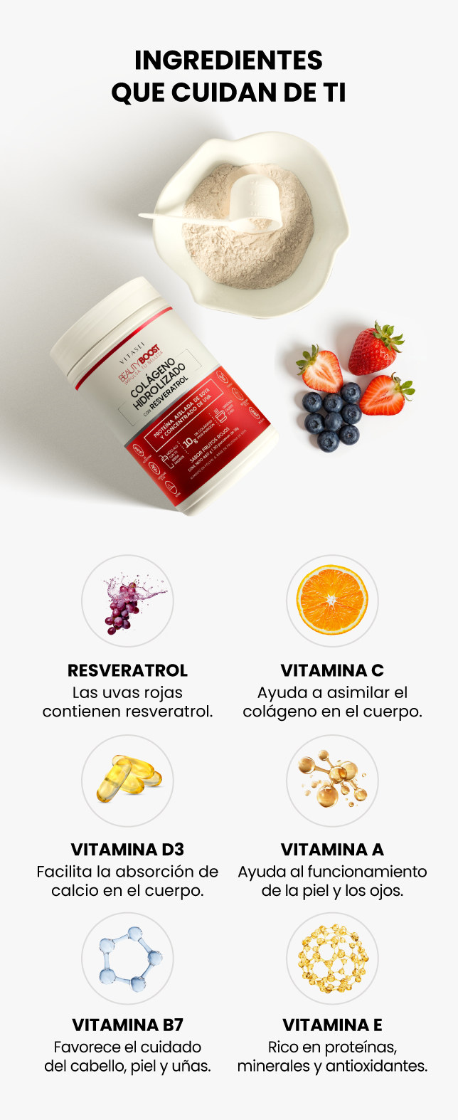 Nuestra fórmula de colágeno está enriquecida con Resveratrol, vitamina A, B1, B6, B7, B12 C, D3 Y E, ingredientes clave para tu belleza y bienestar.