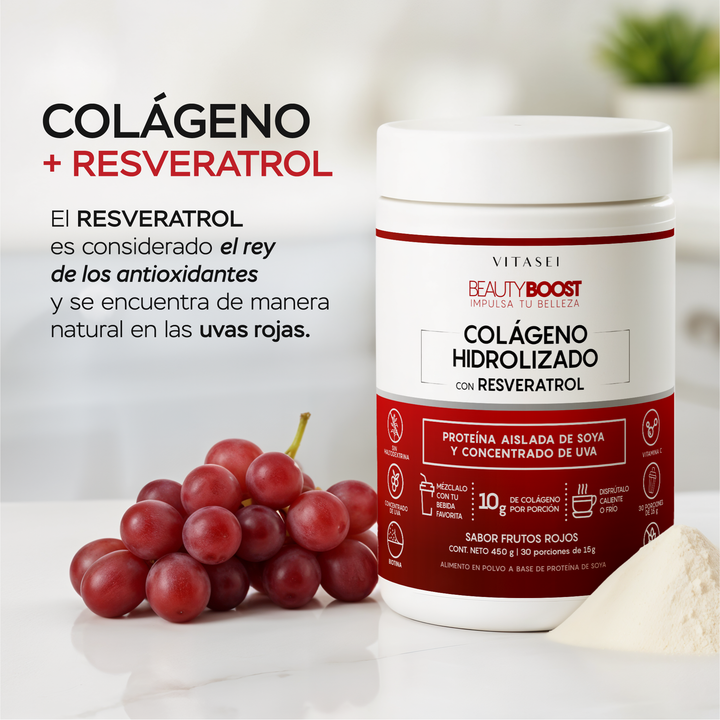 Colágeno Hidrolizado con Resveratrol, Biotina y Vitamina C con sabor Frutos Rojos - Fórmula con base de soya libre de edulcorantes 450gr