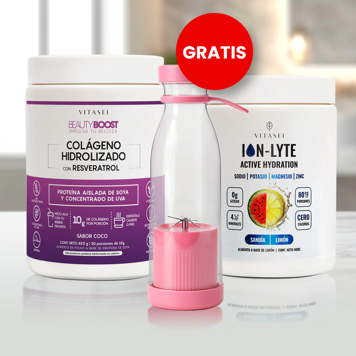 kit Colágeno Hidrolizado con Resveratrol, Biotina sabor Coco a base de soya libre de edulcorantes + electrolitos Ion-Lyte GRATIS Licuadora