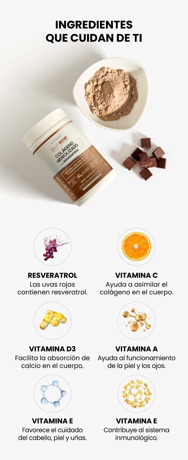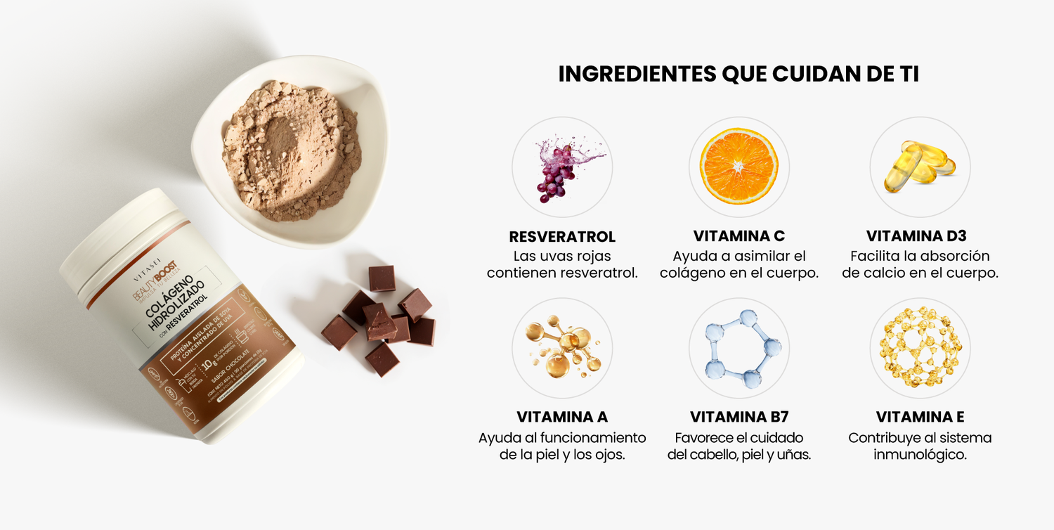 Nuestra fórmula de colágeno está enriquecida con Resveratrol, vitamina A, B1, B6, B7, B12 C, D3 Y E, ingredientes clave para tu belleza y bienestar.