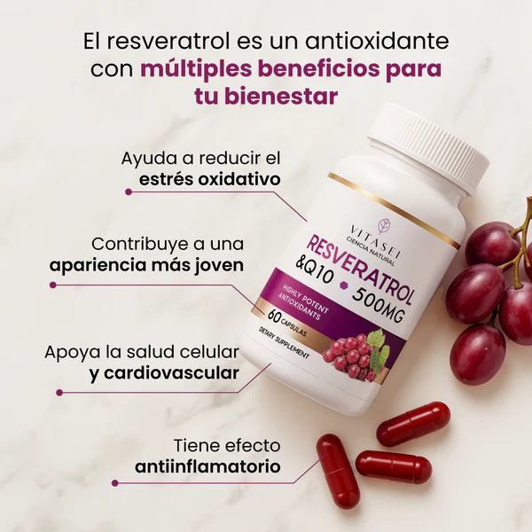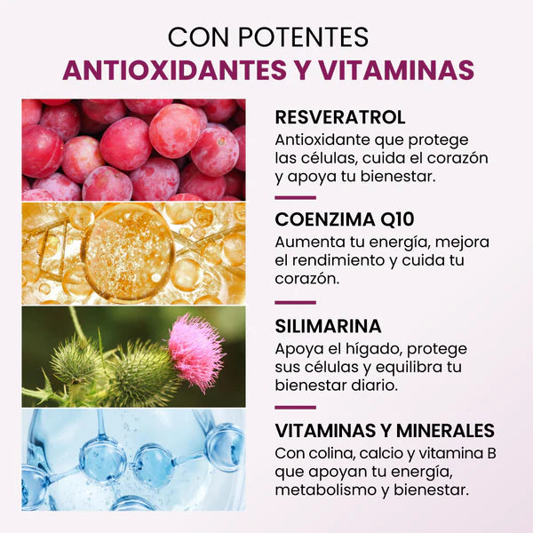 Dale a tu cuerpo el poder del Resveratrol, la Coenzima Q10 y la Silimarina en una sola cápsula diaria. Esta fórmula fue creada para ayudarte a sentirte con más energía, proteger tu corazón y cuidar tu salud celular todos los días.