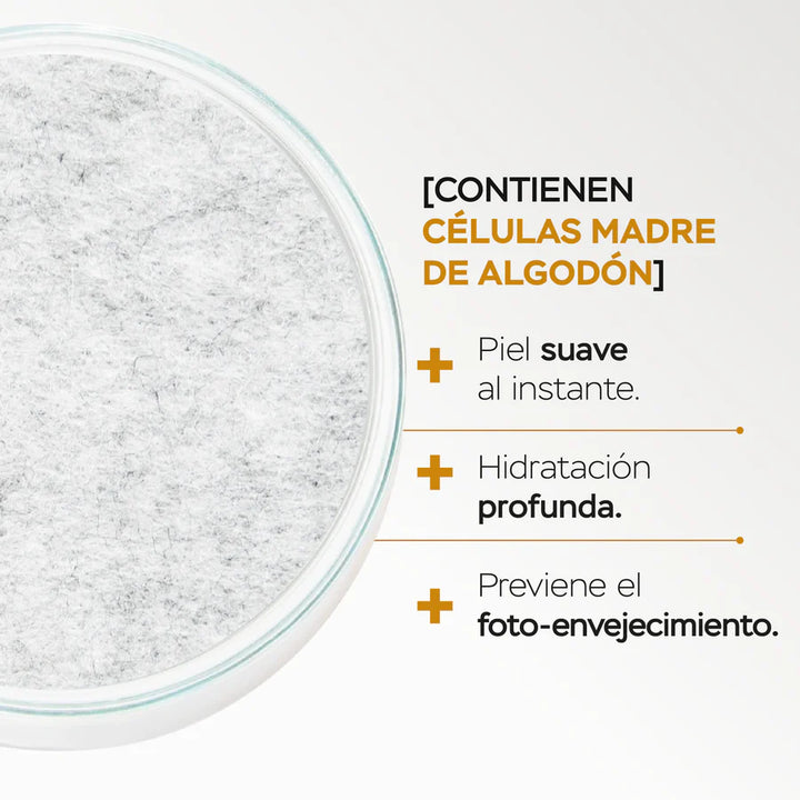 - La fórmula de día está enriquecida con células madre de algodón y ácido hialurónico.