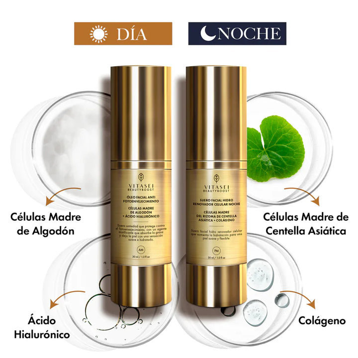 Dúo de sueros faciales a base de células madre para el día y la noche, diseñados contra el foto envejecimiento de la piel, proporcionando una hidratación excepcional. Desde la primera aplicación, sentirás tu piel suave y aterciopelada.